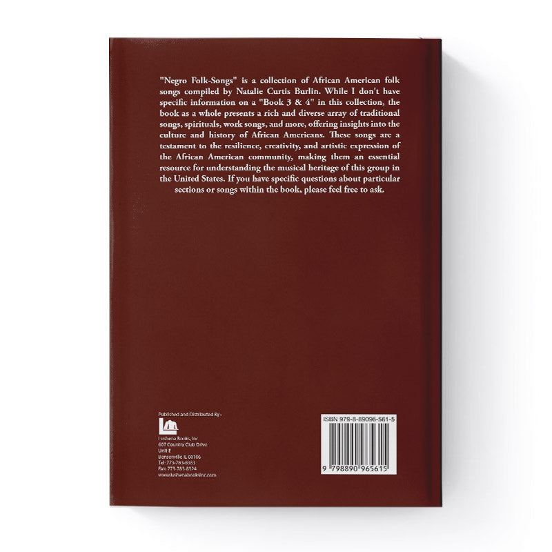 "Negro Folk-Songs" is a collection of African American folk songs compiled by Natalie Curtis Burlin. While I don't have specific information on a "Book 3 & 4" in this collection, the book as a whole presents a rich and diverse array of traditional songs, spirituals, work songs, and more, offering insights into the culture and history of African Americans. These songs are a testament to the resilience, creativity, and artistic expression of the African American community, making them an essential resource for understanding the musical heritage of this group in the United States. If you have specific questions about particular sections or songs within the book, please feel free to ask.